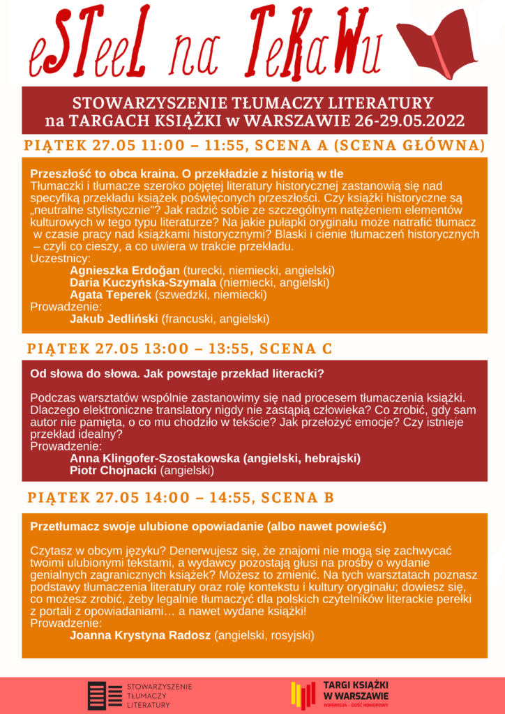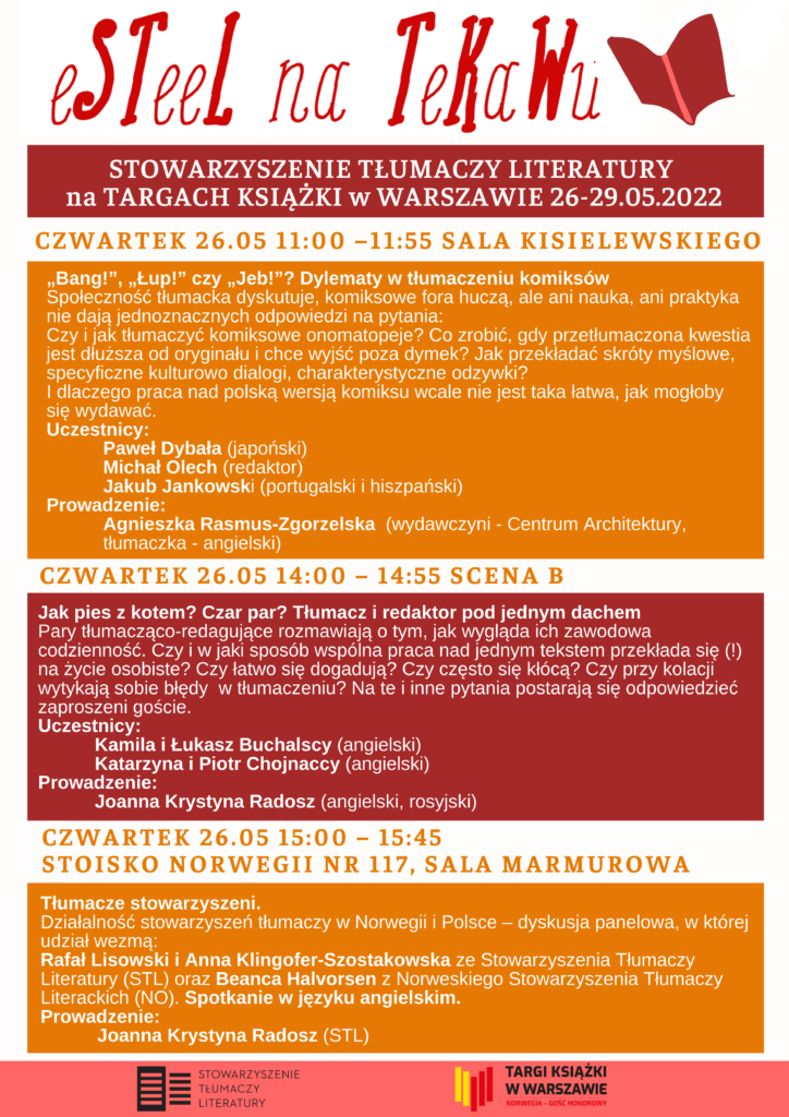Na szczególną uwagę zasługują spotkania, warsztaty i gry organizowane przez STL – Stowarzyszenie Tłumaczy Literatury. Program i poszczególne wydarzenia będę promować publikując je na stronie oraz na FB.